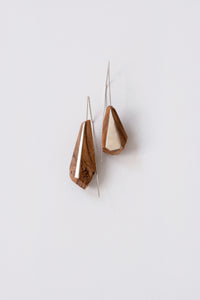 These earrings are individually crafted through a meticulous process. Each silver plate is hand cut, shaped, and fitted with soldered prongs that align with hand-drilled holes in the wood, ensuring a durable, lasting connection. The design explores how light interacts with polished planes and faceted surfaces, emphasizing balance over symmetry. Though mismatched in size and shape, the earrings are proportioned to complement each other and create visual rhythm.