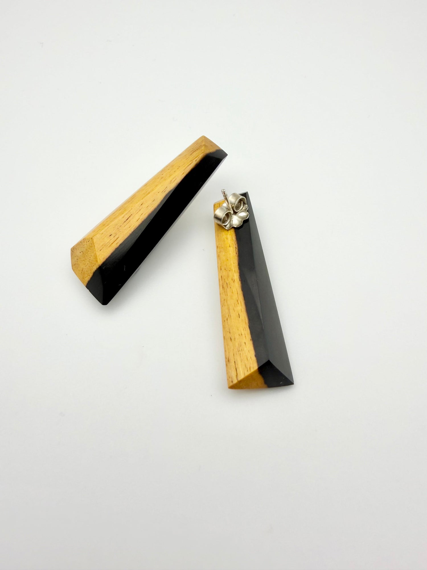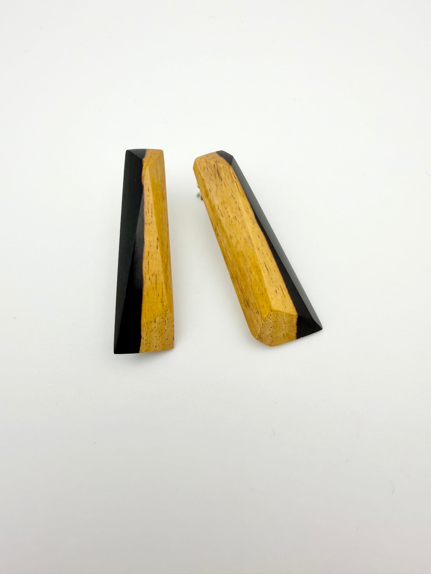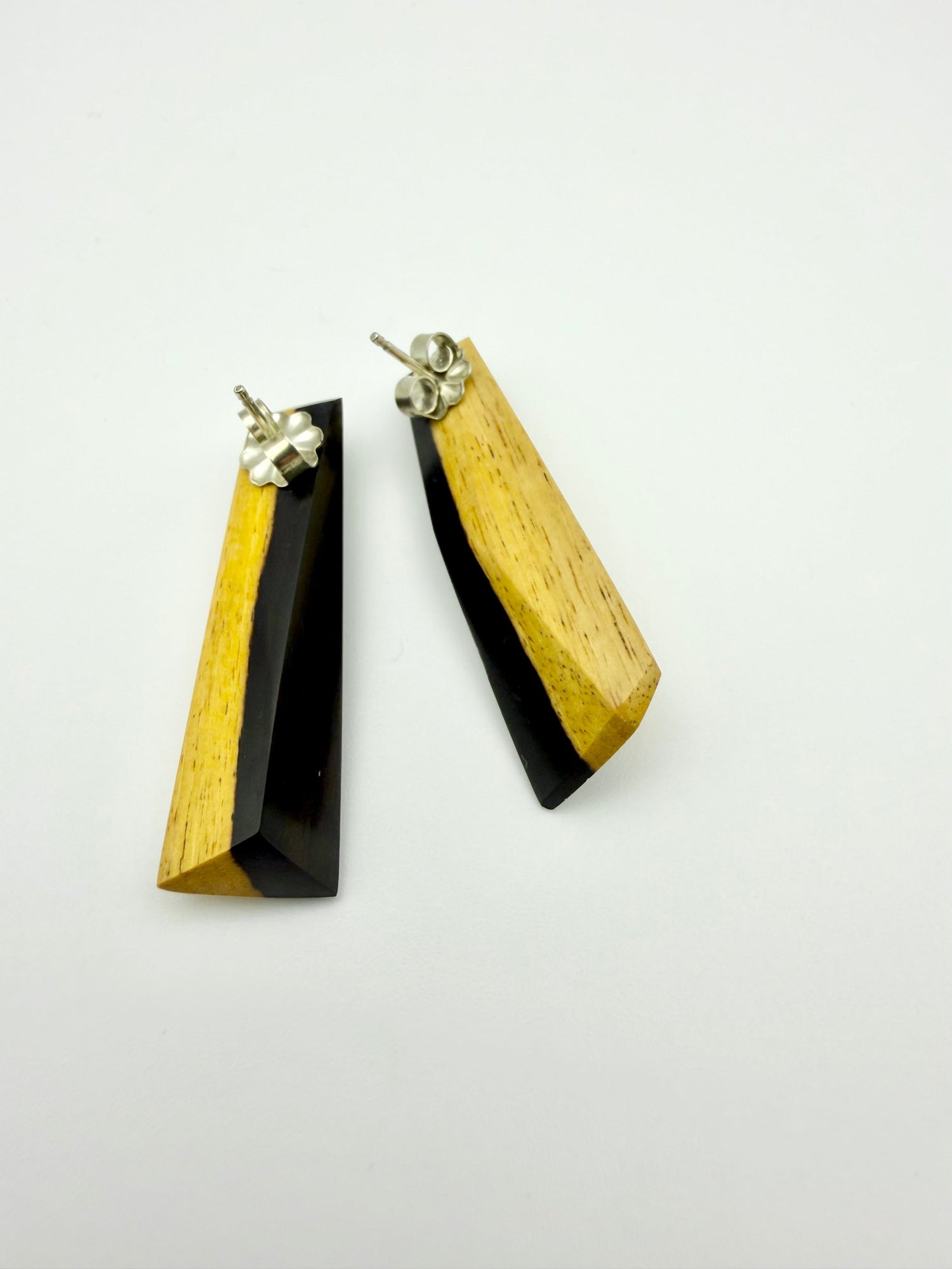 African Blackwood Black & Tan studs. I refer to these as the reversable studs because depending on which ear you wear each one in, it will either feature the tan sap wood or the black heart wood making them extra versatile. Light weight and comfortable for all day wear.
