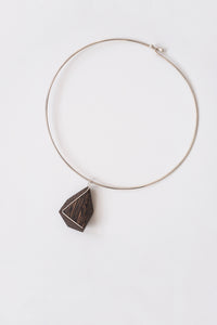 The concept behind the Linear Solution collection is designing a "problem" to be solved into the piece in order to result in a more creative and unexpected piece. When I shape the wood pendant I do not know how I will attach it to a chain or collar. I then have to create a metal detail that responds to the shape in order to create a way to hang it. These pieces take a lot of extra time but the end results are always worth it.